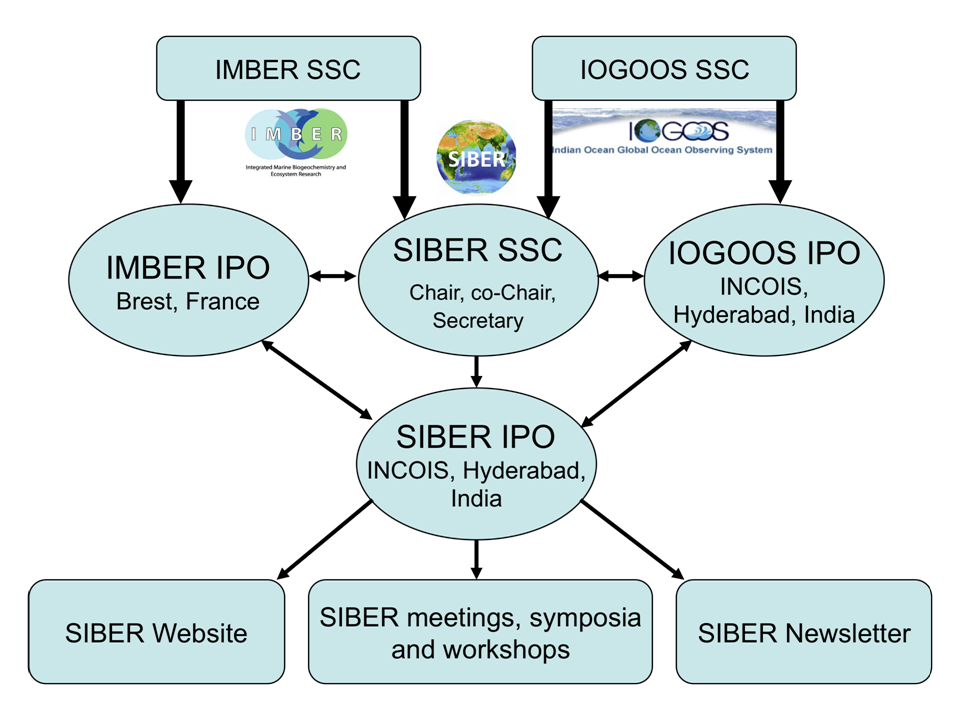The schematic diagram given below illustrates the relationships between the SIBER International Project Office (IPO) and IMBER and IOGOOS IPOs, along with oversight and responsibilities.