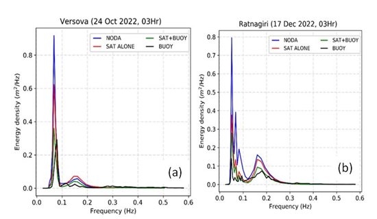 Comparison of 1-dimensional model spectra from data assimilative model to the buoy observed spectra at (a) Versova and (b) Ratnagiri