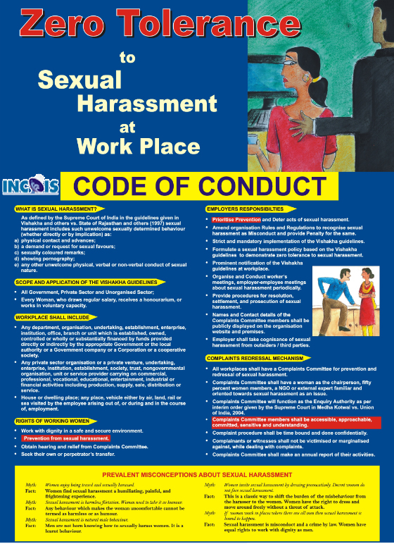 In compliance with the instructions of Ministry of Women and Child Development, Sexual harassment of Women at Workplace (Prevention, Prohibition & Redressal) Act, 2013 was enacted at INCOIS to provide protection against sexual harassment of women at workplace and for the prevention and the redressal of complaints of sexual harassment and for matters connected therewith and incidental thereto. Section 4 of the Act provides that every employer of a workplace shall, by an order in writing, constitute a Committee to be known as the "Internal Complaints Committee".
